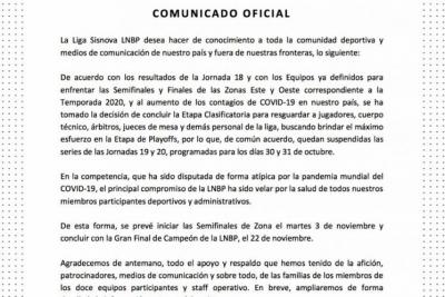 De acuerdo con los resultados de la Jornada 18 y con los Equipos ya definidos para enfrentar las Semifinales y Finales de las Zonas Este y Oeste correspondientes a la Temporada 2020 y debido al aumento de los contagios de COVID-19 en nuestro país, se ha tomado la decisión de concluir la Etapa Clasificatoria para resguardar a jugadores, cuerpo técnico, árbitros, jueces de mesa y demás personal de la liga, buscando brindar el máximo esfuerzo en la Etapa de Playoffs, por lo que, de común acuerdo, quedan suspendidas las series de las Jornadas 19 y 20 programadas para los días 30 y 31 de octubre.